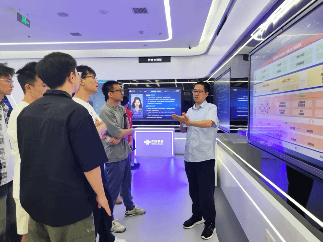在参观数字经济演示厅的过程中,讲解员首先介绍了中国联通在聚焦“网络强国”、“数字中国”两大主责,推进“网络向新、技术向新、服务向新”中所取得的成绩和做出的贡献。随后,师生们跟随讲解员的步伐全面详实了解了中国联通在数字经济、区域经济、重点产业、数字政府、智慧城市、智慧矿山、网络安全等不同场景中的服务和创新。在参观中国联通数字赋能教育行业的发展时,闫永波总监亲自为师生进行了现场讲解,他结合自身多年来的学习和工作经验,简明清晰地为师生们介绍了智慧校园建设的底层逻辑并分析了当前的一些典型实践案例。闫总监的精彩讲解让师生们更为真切地从实务层面感受到了数字技术对教育行业乃至整个社会生活的影响,并引发了他们的思考。