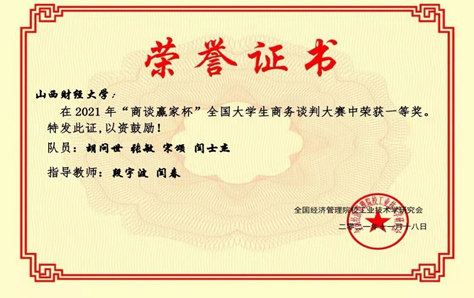 11月12日,我院在2021年“商谈赢家杯”全国大学生商务谈判大赛(中文赛道)中摘得全国大学生商务谈判大赛团队一等奖。这是继我校在10月31日“商谈赢家杯”全国大学生商务谈判大赛(英文赛道)中获得佳绩之后,我校参与该项赛事取得又一优异成绩。我校获奖队伍“春天会暗送秋波吗队”由太阳成集团tyc234cc-主页段宇波、工商管理学院闫春老师联合指导,队员分别是来自太阳成集团tyc234cc-主页2019级行政管理专业胡问世、闫士杰,2019级劳动与社会保障专业宋颂,会计学院2019级资产评估专业张敏。