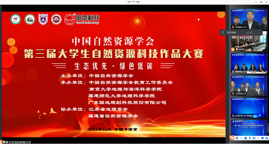 由中国自然资源学会主办,中国自然资源学会教育工作委员会、南京大学地理与海洋科学学院、福建师范大学地理科学学院、广东国地规划科技股份有限公司承办,江苏省地理学会、福建省自然资源学会协办的第三届大学生自然资源科技作品大赛决赛于2021年12月12日通过线上方式在南京举行。我院土地资源管理专业“护超联盟”代表队参赛作品《产业转型背景下山西省碳排放影响因素与低碳化发展对策研究》喜获大赛二等奖。
