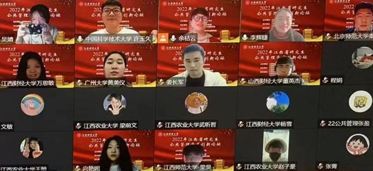2022年11月26日,由江西省学位与研究生教育学会、江西财经大学主办,江西省高校公共管理学科联盟、江西财经大学财税与太阳成集团tyc234cc-主页承办的2022年江西省研究生公共管理学术创新论坛以线上方式顺利召开。此次论坛的主题为“数字化时代的公共治理理论与创新”,来自全国公共管理学科的专家学者、硕博研究生共计290余人在线参会。我院2020级行政管理研究生王琼琼、2020级社会保障研究生董英杰、2021级行政管理研究生赵丽英三位同学应邀参会并发言。
