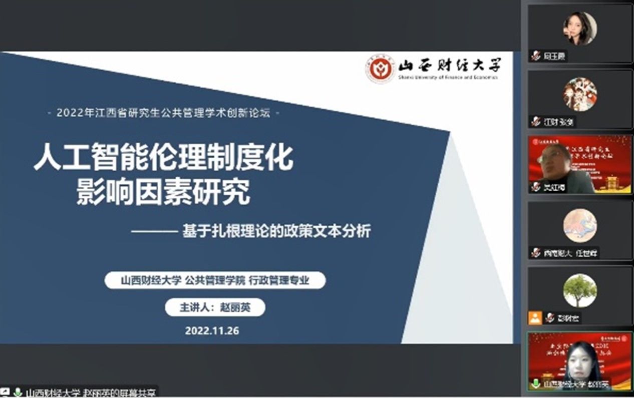 下午的平行分论坛中,赵丽英同学在分论坛三作题为《人工智能伦理制度化的影响因素研究——基于扎根理论的政策文本分析》的会议发言,南昌航空大学吴红梅教授和江西财经大学彭树宏副教授就论文选题与内容的论述给予了充分肯定,在此基础上对论文研究方法的细节部分给出了相应的优化建议。