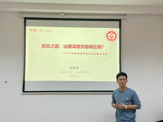 11月16日下午,“待见·学术工作坊”举办了第三期学术研讨活动。劳动与社会保障系郭儒鹏博士作了题为“脱贫之困:治理深度贫困难在哪里?——田野调查中的文化现象与思考”的学术分享。活动由行政管理系主任刘海燕主持。