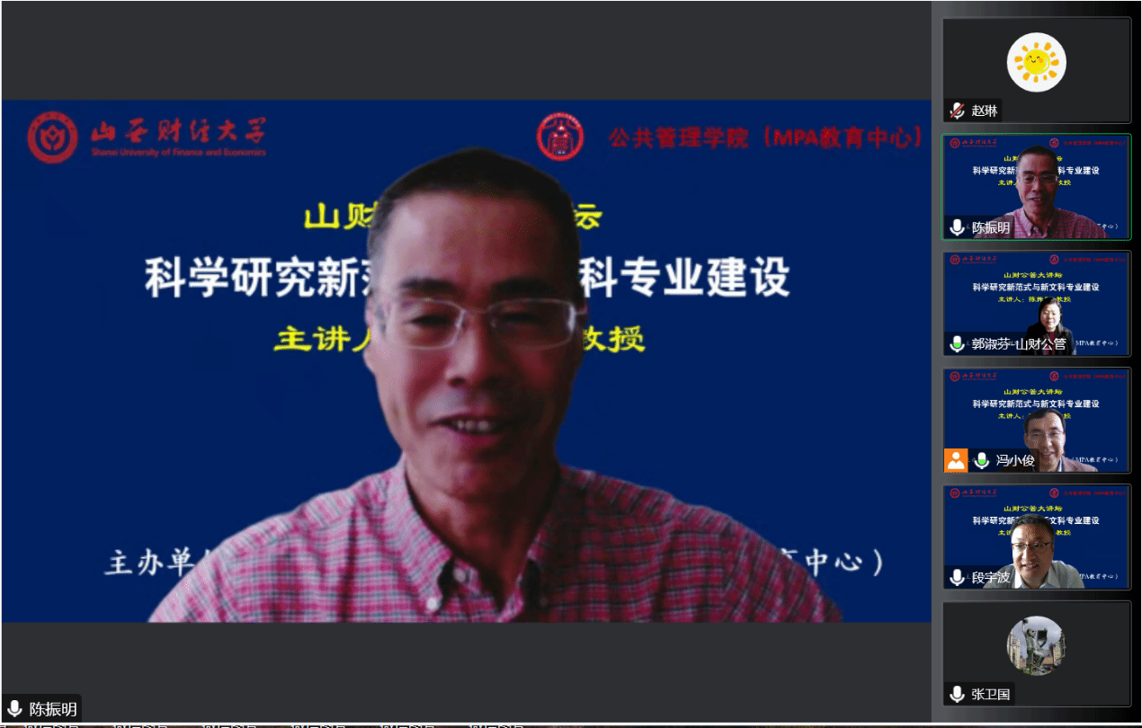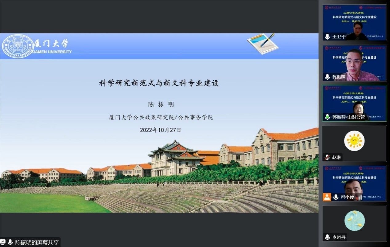 2022年10月27日,由太阳成集团tyc234cc-主页主办的“山财公管大讲坛”正式开讲,厦门大学公共政策研究院教授兼院长、厦门大学社会科学学部主任、“长江学者”特聘教授陈振明拨冗莅临第一讲做了题为“科学研究新范式与新文科专业建设”的报告。校党委副书记、公共管理一级学科带头人王卫平教授主持了本次大讲坛。来自校内外的300余名师生线上聆听了报告。