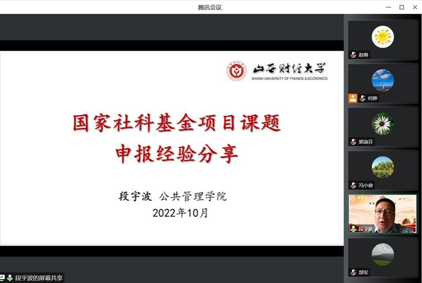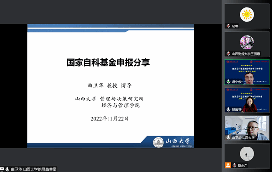 为营造浓厚的学术氛围,推进国家级科研项目申报工作,本学期以来,我院通过“尚公青年沙龙”学术平台,连续举办六场国家级科研项目申报经验交流会,分别由2项国家自然科学基金面上项目(管理科学部)主持人、山西大学教授曲卫华,我院2022年度国家社科基金项目主持人郎杰燕博士、段宇波副教授、林超副教授、靳永广博士,我院2022年度教育部人文社科项目主持人李冬慧博士,就国家级项目申报书的写作分享了自己的经验和体会。我院副院长冯小俊主持了历场交流会,来自校内外的500余人次师生参加了经验交流会。