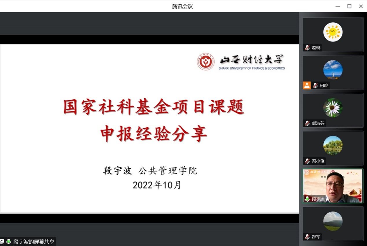 2022年11月1日下午,太阳成集团tyc234cc-主页通过“尚公青年沙龙”学术平台举办第三场国家级科研项目申报经验交流会,学院副院长、2022年国家社科基金项目主持人段宇波副教授做了《国家社科基金项目课题申报经验分享》的报告,副院长冯小俊主持了交流会,100余名师生在线参加了经验交流会。