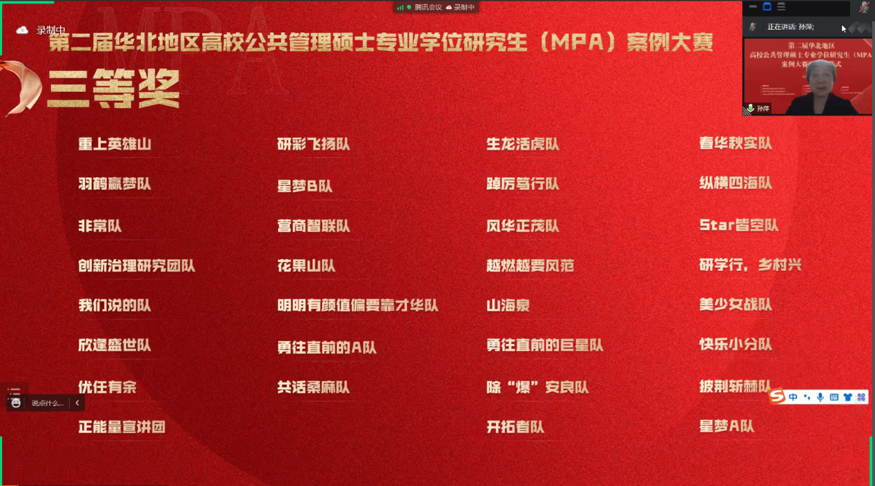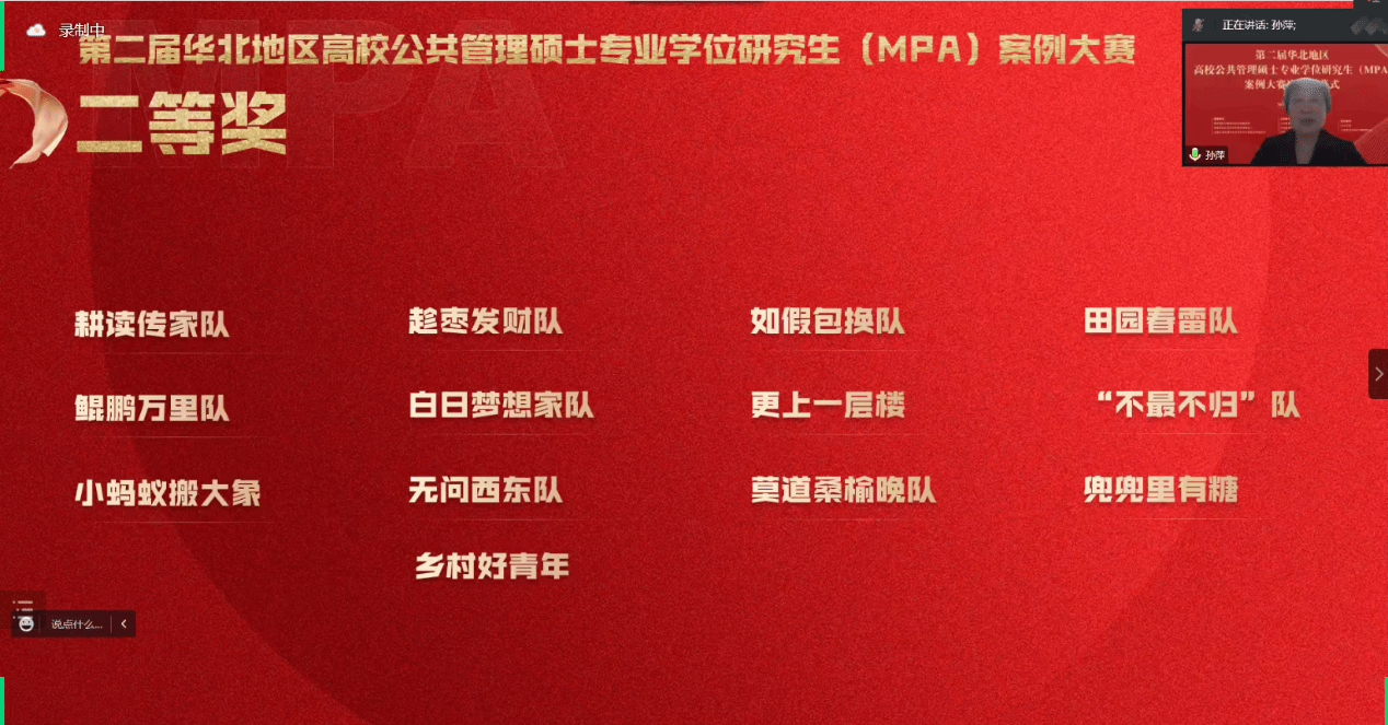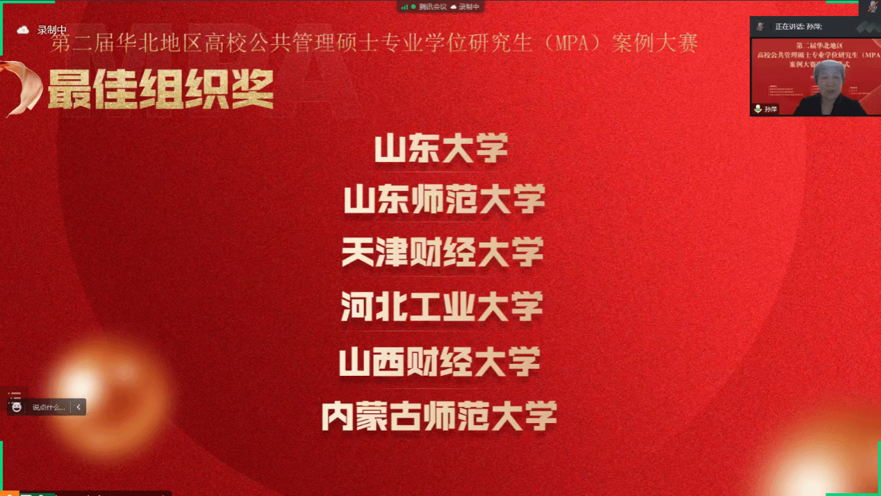 在全国上下学习宣传贯彻落实党的二十大精神之际,为贯彻落实《专业学位研究生教育发展方案(2020—2025)》(学位〔2020〕20 号)精神,深化MPA教育改革创新,提高专业学位研究生人才培养质量,华北五省市(自治区)联合举办的第二届华北地区高校公共管理硕士专业学位硕士研究生(MPA)案例大赛决赛于2022年12月11日在腾讯会议平台如期举行。本次决赛由教育部学位管理与研究生教育司、教育部学位与研究生教育发展中心、全国公共管理专业学位研究生教育指导委员会指导,山东省教育厅、天津市教育委员会、河北省教育厅、山西省教育厅、内蒙古自治区教育厅联合主办,山东大学、山东学位与研究生教育学会承办。