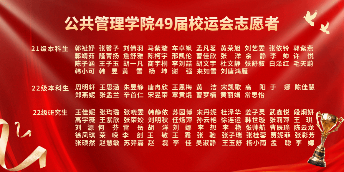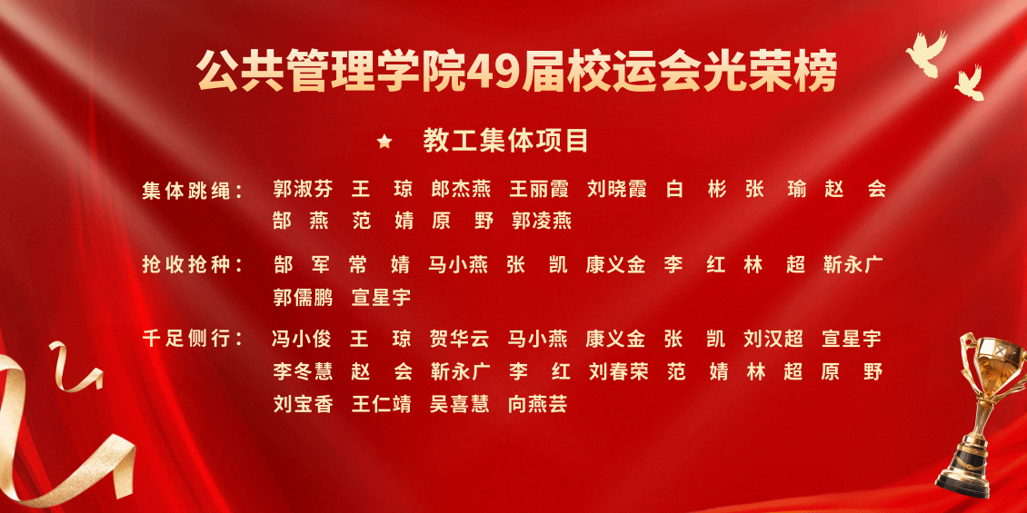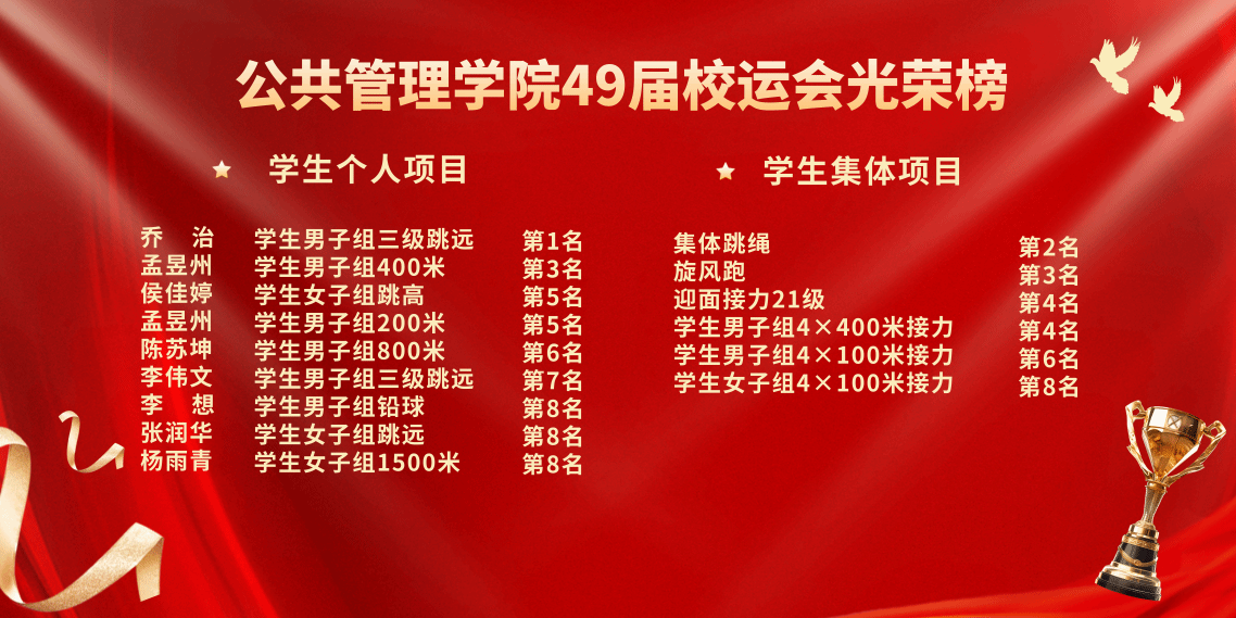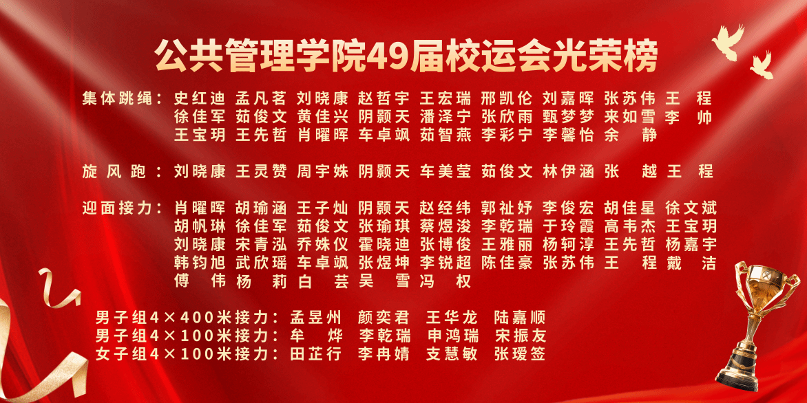 千帆竞发,百舸争流。校运会圆满结束,但闭幕不落幕。顽强拼搏、奋勇争先的体育精神将鼓舞公管人以梦想为帆、以奋斗作桨,全面贯彻新时代党的教育方针,认真落实立德树人根本任务,弘扬践行体育精神,养成良好学习工作习惯和健康生活方式,为学院高质发展蓄势赋能!(编辑制作:22社保研究生张玙璐)