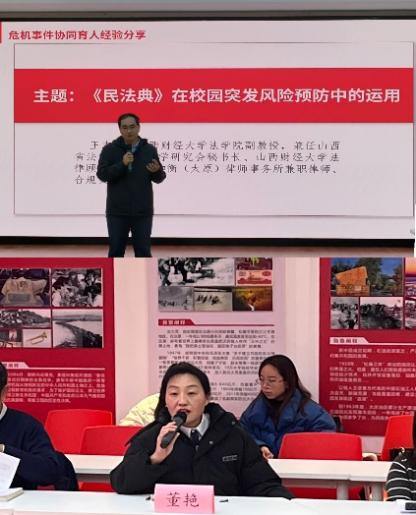 第三环节特邀法学院副教授王志林和公寓楼长董艳与辅导员分享了协同育人经验。王志林教授以《民法典在校园突发事件风险预防》为题,从民法规定、危机事件定性、积极调整沟通策略和话术等方面做了经验分享。董艳楼长从公寓管理制度和工作实际出发,分析了公寓管理人员人文关怀对有效防范化解危机事件的前置和促进作用,并表示公寓工作人员将全力为学生的生活学习“保驾护航”。