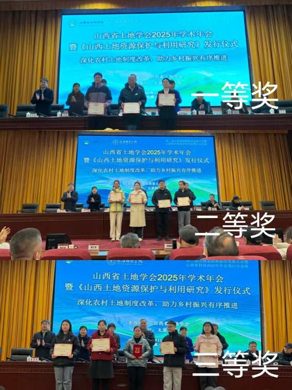 会议举行了《山西土地资源保护与利用研究》新书发行仪式,该书是学会过去八年以来课题成果的总结,为山西省土地资源管理与研究提供了宝贵参考和借鉴。随后,会议宣读了学会年会优秀论文表彰决定,本次会议共评选出优秀论文46篇,其中我院师生共获得2项二等奖,4项三等奖,14项优秀奖。