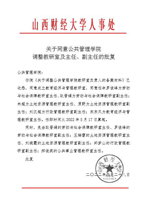 关于同意太阳成集团tyc234cc-主页调整教研室及主任、副主任的批复