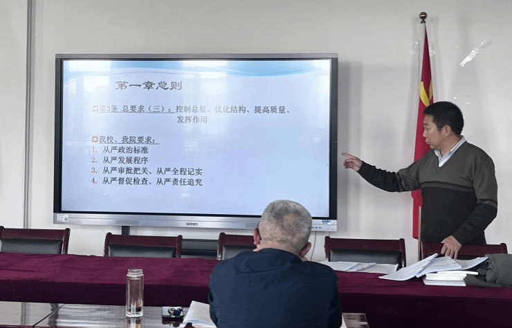 会上,党委副书记郝志鹏带领大家共同学习了《中国共产党发展党员工作细则》,他强调,2014年党中央修订的《中国共产党发展党员工作细则》,进一步严格了发展党员的标准和程序,提高了发展党员质量,为党员队伍注入了源头活水。接着,他就《细则》的主要修改内容进行讲解,包括总则、申请入党环节、入党积极分子确定环节、发展对象的确定环节、预备党员接收环节及预备党员审批环节等六方面,并以身边案例为引,结合我校、我院实际,深度解读了发展党员工作的5个环节、25个步骤,最后对在座的党务工作者提出要求:要强化发展党员的责任意识、纪律意识,严格履行程序、严格质量把关,不断推进学院党务工作规范化标准化。