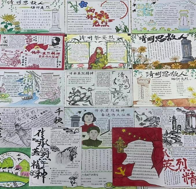 诗韵赤诚传心意,字里行间寄真情。同学们将缅怀之情寄托于纸笔,写出一首首情真意切的三行诗,借助文字的力量传达心中对革命先辈的敬仰与哀思。同时,同学们创新表现形式,立足于清明节的历史起源、文化传统,结合英雄伟绩、先烈故事,创作出许多精美的手抄报。最后,本次活动共收回作品162份,评选出优秀作品40份。