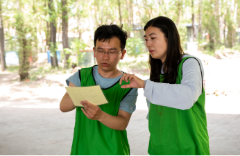 活动伊始,参加活动的师生在“互相拍背”、“反手捏鼻”等小游戏中舒缓了身心,拉近了彼此距离。随后,培训师将大家分为了三支队伍,各队通过自我介绍、推举队长、制定队名口号、制作队旗等一系列环节完成了团队建设。最终, “无敌队”、“蓝色闪电队”和“绿水青山队”横空出世,并依次进行了团队展示,展现出了大家良好的精神风貌。
