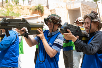 紧接着,正式的拓展训练开始。在“真人CS”项目中,三队分组对抗,师生们“荷枪实弹”、全副武装,以高涨的热情投入到虚拟的“战场”中。在掩体、草丛、树木的遮挡下,师生们躲避、瞄准、射击,体验到了肾上腺素的急速飙升;在一次次埋伏包围、掩护突袭中,团队协作与战术安排发挥的淋漓尽致。项目结束后,虽然大家一个个灰头土脸、汗流浃背,但团队的凝聚力得到了明显提升。